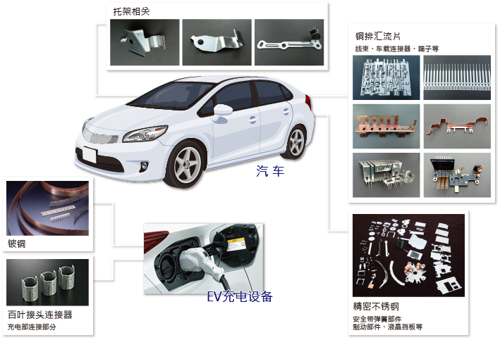 此外,本公司還在為今后有發(fā)展?jié)摿Φ男履茉雌?chē)的電裝系統(tǒng)(線束、車(chē)載連接器端子)中所使用的不銹鋼、 鋁、銅合金和電鍍材料等方面提供廣泛的供應(yīng)。利用本公司的加工基地,也可以供應(yīng)母線和鑲件成形品。
